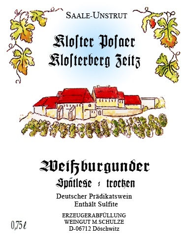 Nach langer Reife am Rebstock in der sonnenverwöhnten Lage Kloster Posaer Klosterberg in Zeitz wurden die Trauben für diesen Weißburgunder als eine der letzten geerntet und als hochwertige Spätlese zum keltern in den Winzerkeller gebracht. Dort entstand ein feinfruchtiger Weißwein, der mit typischen Aromen von knackigen Äpfeln, zarten Aprikosen und einer feinen Note von exotischer Ananas die Geschmacksnerven betört.